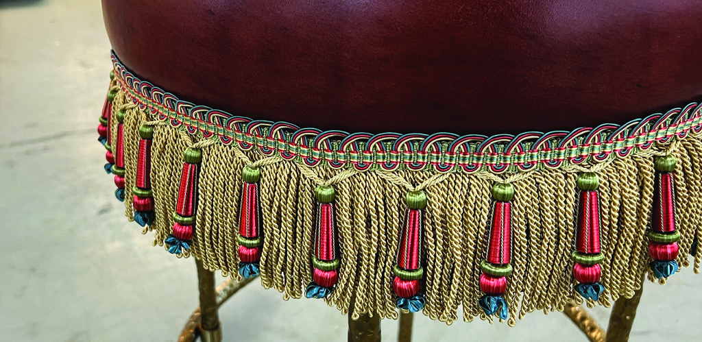 When durability is not the issue, seams and exposed fabric edges can be covered or enhanced with gimp, fringe, and tassels. Gimp, a decorative ribbon, primarily covers exposed fabric edges. Available in myriad colors and styles, gimp can range from exceedingly simple to incredibly ornate. Some has metallic threads braided through, while others are woven in complicated geometric patterns. A DIYer can choose a beautiful gimp to hide their project’s not so beautiful upholstery tacks and staple gun staples.